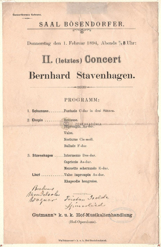 Műsor: Schumann, Chopin és Stavenhagen zongoraművei ill. Liszt: Asz-dúr Valse impromptu, Magyar rapszódia (?)
