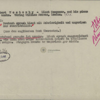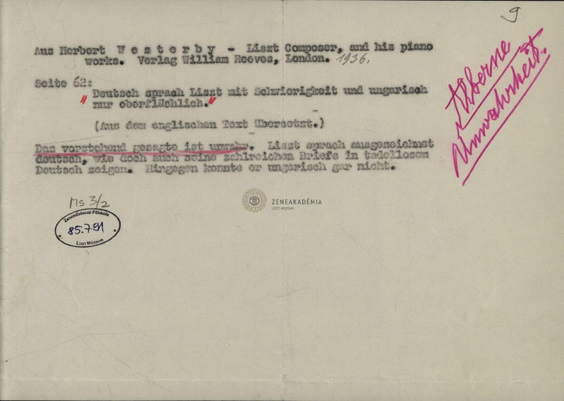 Idézet Herbert Westerby Liszt Composer and his piano works című művéből (62.oldal) Liszt német és magyar nyelvtudásáról. "Deutsch sprach Liszt mit Schwierigkeit und ungarisch nur oberflächlich." Ismeretlen személytől hozzáfűzött megjegyzés: "Das vorstehend gesagte ist unwahr. Liszt sprach ausgezeichnet deutsch, wie doch auch seine zahlreichen Briefe in tadellosem Deutsch zeigen. Hingegen konnte er ungarisch gar nicht."