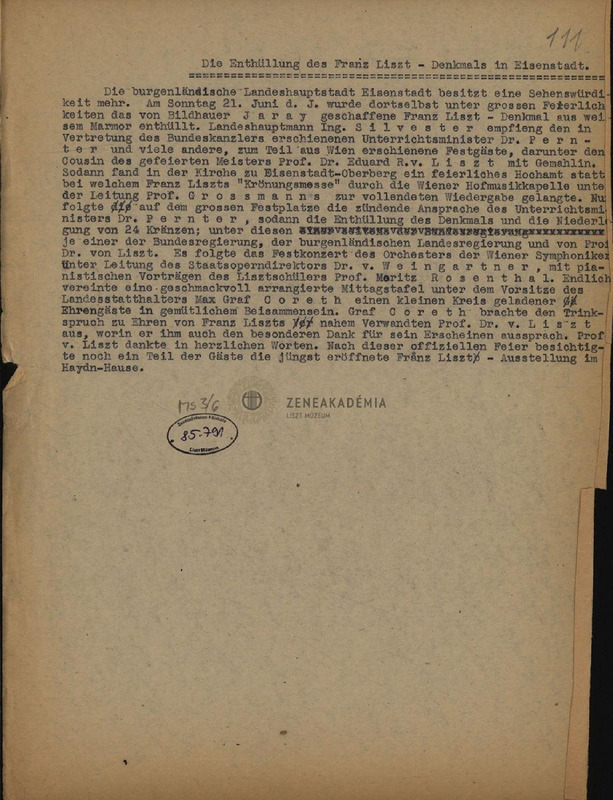 Eduard Liszt feljegyzései a kismartoni Liszt-emlékmű felavatásáról. Egyoldalas gépirat.