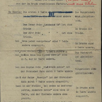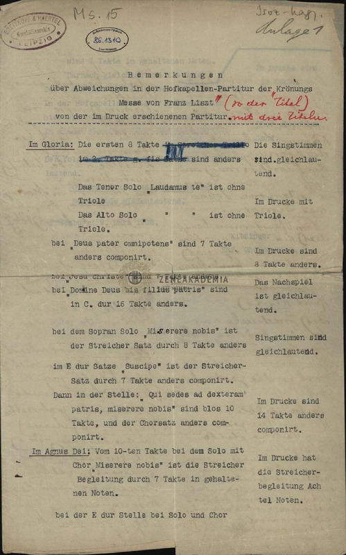 3 oldalas, részben gép-, részben kézirat. Részletes leírás az eltérésekről. Bal felső sarokban bélyegző: Breitkopf & Härtel Geschäfstarchiv, Lepzig. Aláírás: Kitzinger, Ehr. Chormeister.