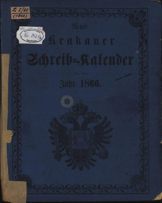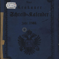 "Neuer Krakauer Schreibkalender für das Jahr 1866." Néhol tintával írt kézírásos lapok a kalendárium lapjai közé téve.
