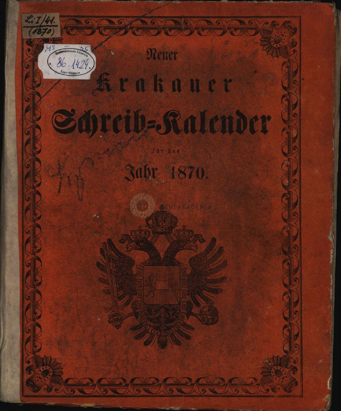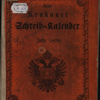 "Neuer Krakauer Schreib-Kalendar für das Jahr 1870." Néhol a lapok közé barna tintával írott kézírásos lapok betéve.