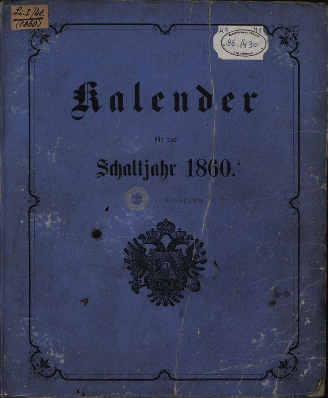 "Neuer Krakauer auf Wien Berechneter Schreib-Kalender auf das Schaltjahr nach der Geburt Jesu Christi 1860." Néhol tintával írt kézírásos lapok a kalendárium lapjai közé téve. Hátsó borító hiányzik, a kalendárium valószínűleg hiányos.