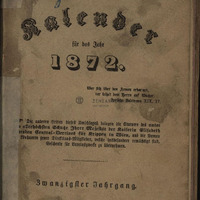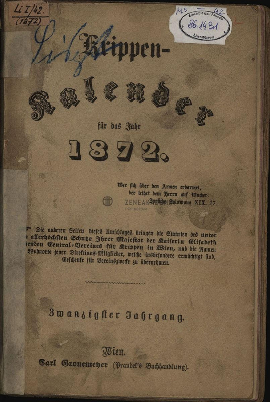"Krippen-Kalender für 1872. Jahrbuch für Frauen und Mütter." Több helyen tintával kézel írt oldalak. Borítólapon kék ceruzával, kézzel írva Liszt neve.