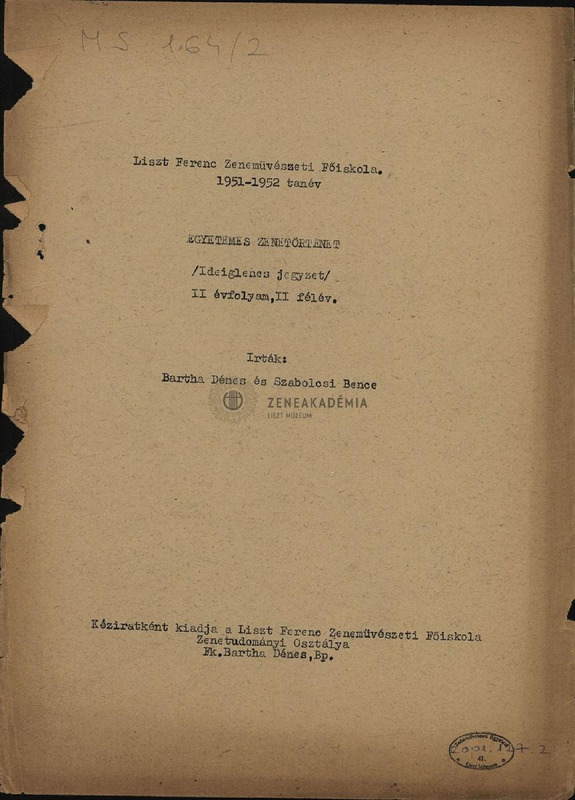 Az 1949-50-ben lefolyt zenetörtneti előadások anyaga.
