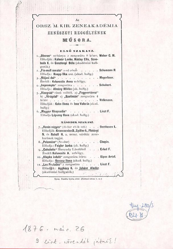 - Műsor: Weber, Schumann, Meyerbeer, Volkmann, Beethoven, Chopin, Erkel, Sipos Antal és Liszt művei. Közreműködnek a Zeneakadémia diákjai.
