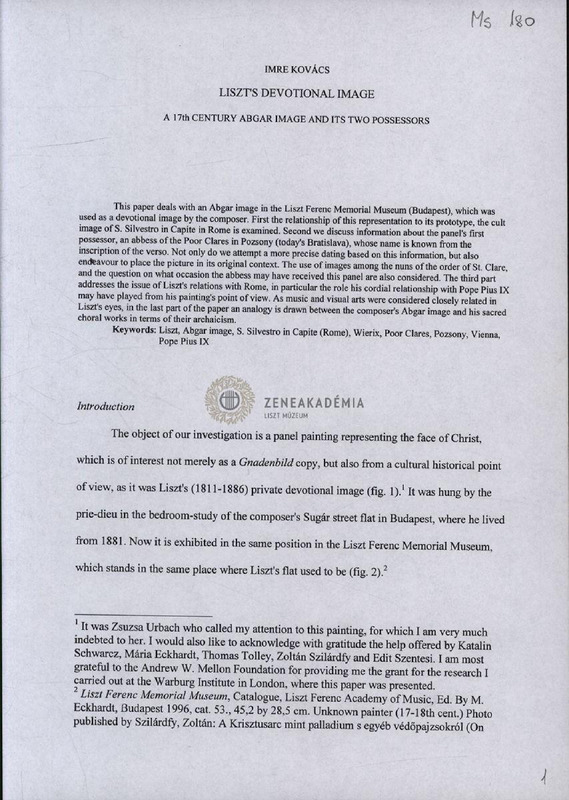 Kovács Imre: Liszts devotional image. A 17th century Abgar image and its two possessors.