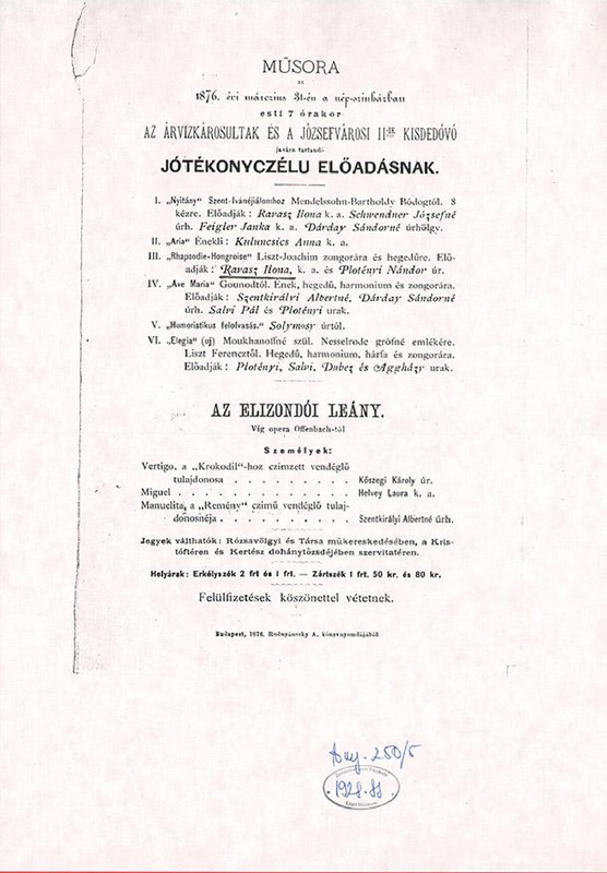 Műsor: Mendelssohn, Liszt és Gounod művei (tk. Plotényi, Aggházy km.) ill. Offenbach: Az elizondói leány c. vígoperája.