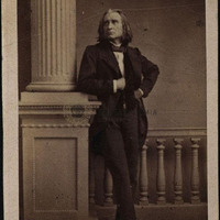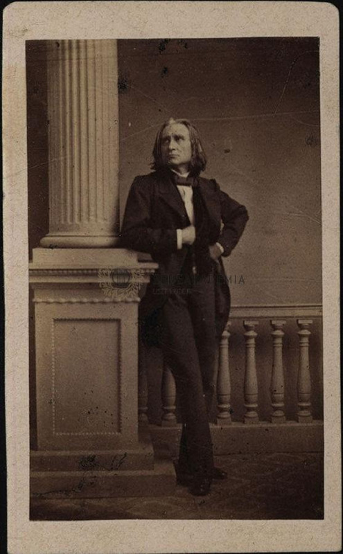 A sötét nadrágot és kabátot vielő Liszt díszes oszlopnál áll, a talapzatra könyököl. Bal kezét csípőre teszi. Mögötte oszlopos ballusztrád.