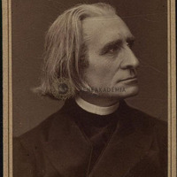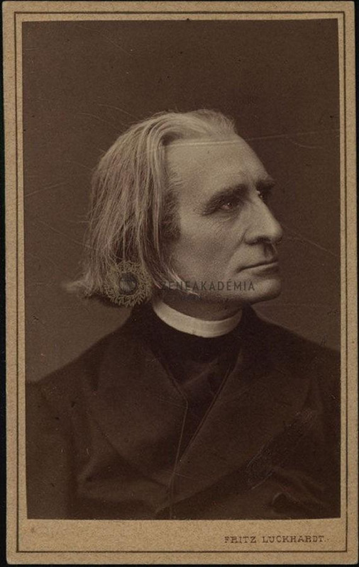 Jobbra néző mellkép. Liszt két soros kabátot visel papi gallérral.
