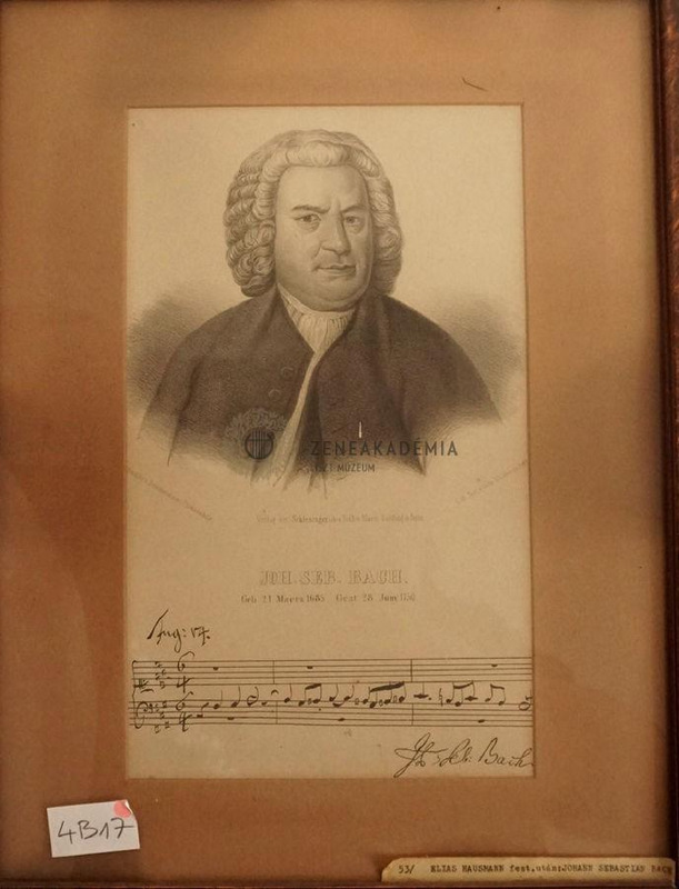 Johann Sebastian Bach mellképe szemből. Alatta: Verlag der Schlesingerschen Buch-u Musik-Handlung in Berlin; Lith Just v. Gebr. Waldow in Berlin. Alatta: Joh. Seb. Bach. Közvetlen alatta: Geb. 21 Maerz 1685, Gest. 28. Juny 1750. Legalul: 2 sor kotta