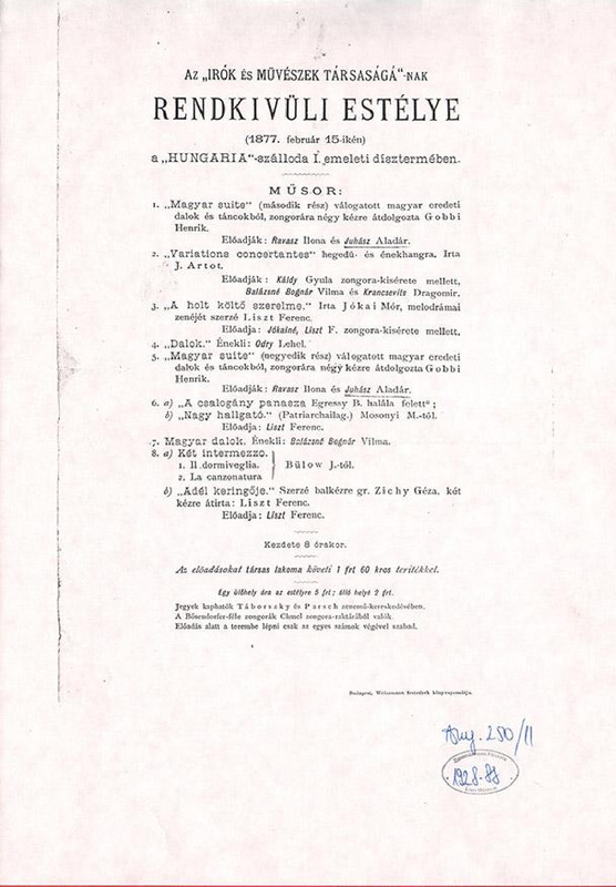 Műsor: zongoraművek és dalok, Liszt: Adél keringője c. Zichy átiratát játsza, elhangzik még Liszt: A holt költő szerelme c. melodrámája Jókai művére (Juhász és Jókainé előadásában).