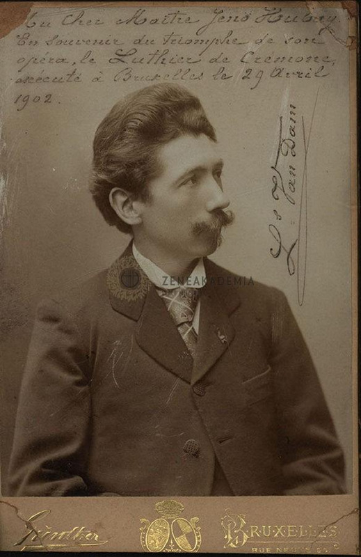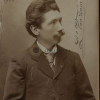 Kabinet fénykép. Az ülő művész kissé jobbra fordul, arca jobb profilból látható. Zakója alatt kockás fényes selyemnyakkendőt visel, zakója hajtókáján kitűző.