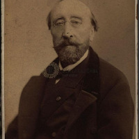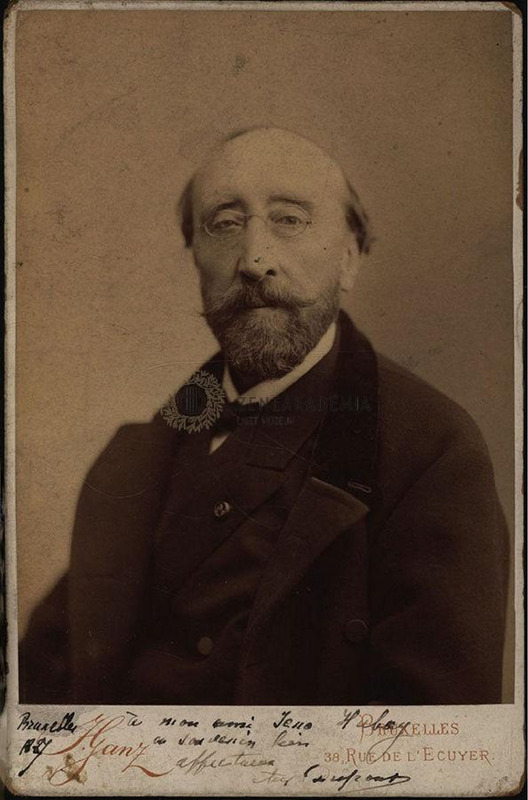 Kabinetfotó, az idősödő szakállas úr jobbra fordulva ül, szembe néz. Kabátja kigombolva, alatt begombolt zakó és csokornyakkendő.
