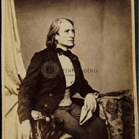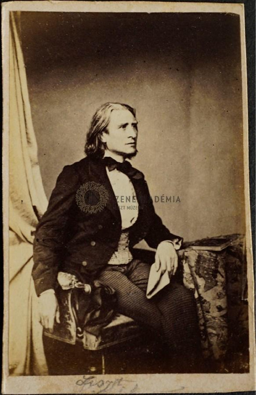 Liszt Ferencet ábrázoló fotó 1858-ból. Münchenben készült. Liszt Ferenc karosszékben ül, csokornyakkendőt visel.