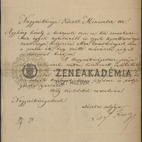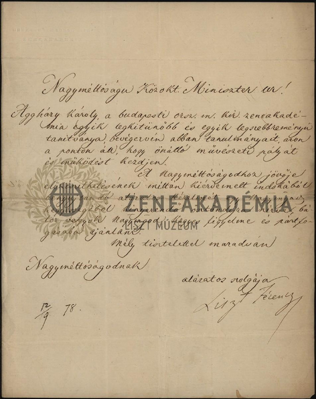Liszt Ferenc levele a Zeneakadémia dombornyomatos papírjára Trefort Ágoston közoktatásügyi miniszternek, amelyben kiváló tanítványa, az éppen az orsz. m. kir. Zeneakadémiát elvégzett Aggházy Károly ösztöndíja ügyében száll síkra. A levél szövege nem Liszt kézírás, az aláírás viszont saját kezű autográf.