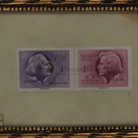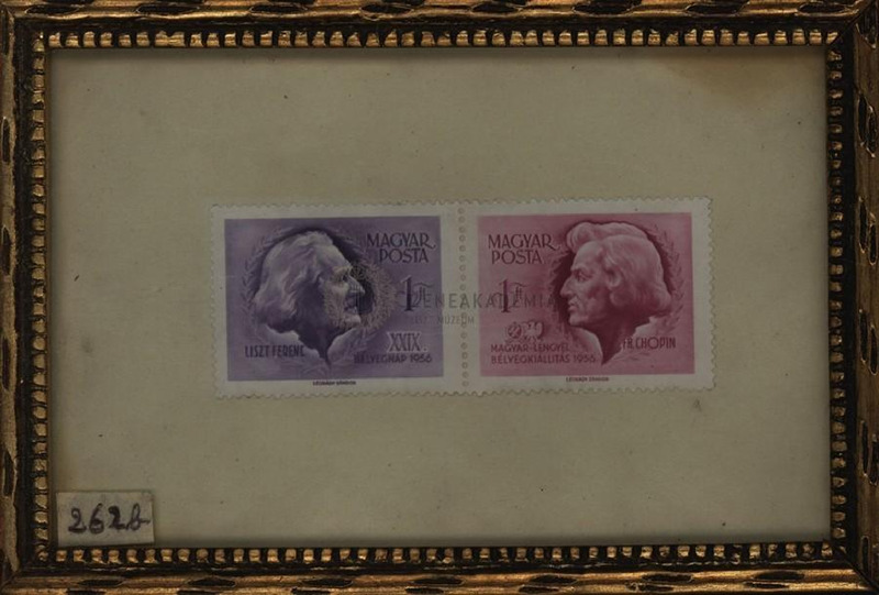 Liszt jobb profilban, kékeslila alapon, értéke: 1 Ft. Felirat: Liszt Ferenc, XXIX. Bélyegnap 1956. Chopin bal profilban, rózsaszín alapon, értéke 1 Ft. Felirat: Fr. Chopin, Magyar-Lengyel bélyegkiállítás 1956. Jelezve alul, középen mindkettő: Légrády Sándor; Aranyozott keretben