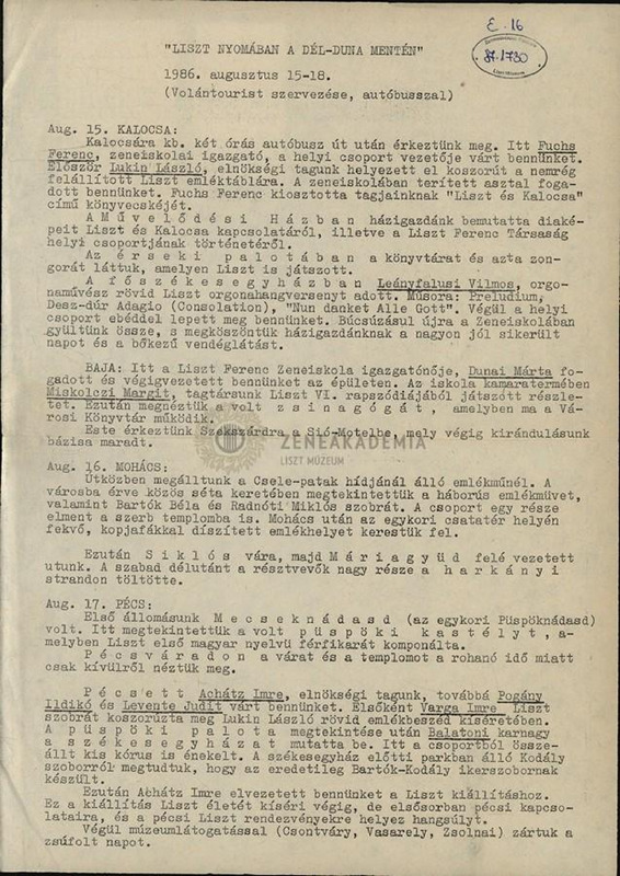 - "Liszt nyomában a Dél-Duna mentén"" /Kalocsa, Baja, Mohács, Pécs, Szekszárd az érintett városok/. Volántourist szervezésében. Mellékelve kétféle Liszt-bélyeg: magyar és osztrák kiadású.
