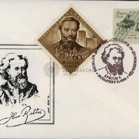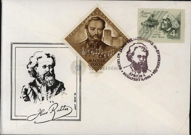 A két bélyeg alatt kör alakú pecsét. Richter Jánost ábrázolja. A kör szélén felirat: Budapest, 1993. április 5. Richter János születésének 150. évfordulója.