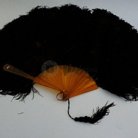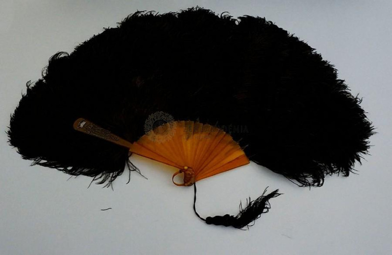 - Fekete toll legyező, ámbrából készült narancssárga nyéllel. Bal legyezőszáron signature: ""Creusy Paris"" Jobb nyél tetején ezüstből korona és egy ""M"" betű virágos háttérrel kiképezve.