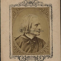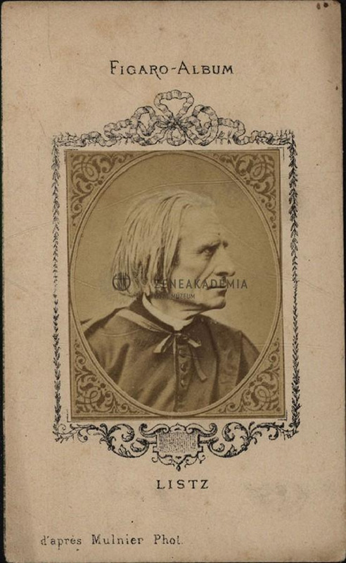 A középkorú Liszt Ferenc abbé ruhát visel, haja őszes. Névjegy formátumú papíron, díszes keretben.