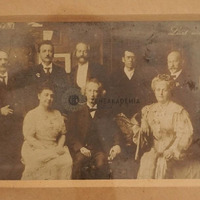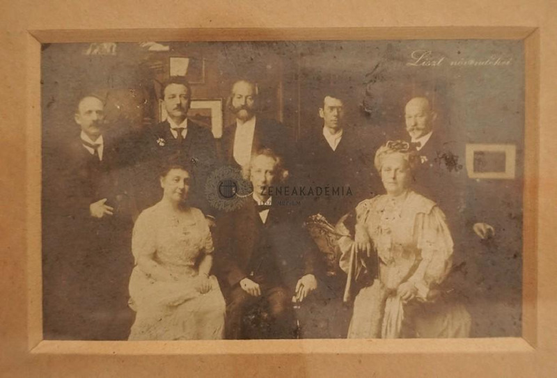 Liszt nyolc növende, akik az 1911-es ünnepségeken részt vettek. A kép jobb felső sarkában: ""Liszt növendékei"". Alul baloldalt: ""Foto Labori Budapest 1911"". Balról jobbra ülnek: Vera Timanova, Emil Sauer, Göllerichné Voigt Gizella. Állnak: Thomán István, Bernhard Stavenhagen, August Göllerich, Szendy Árpád, Martin Krause.