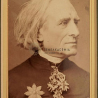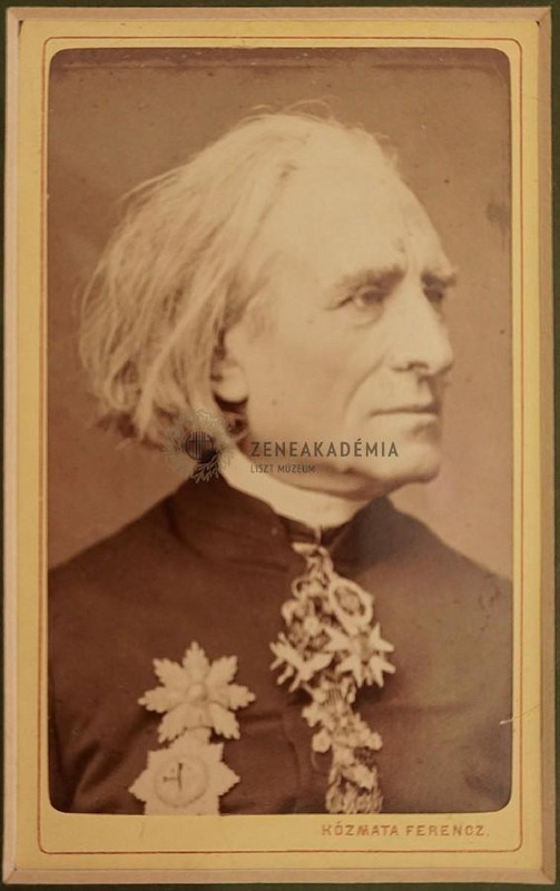 Liszt Ferenc jobb félprofilban látható, reverendát visel, számos rendjellel a mellén.