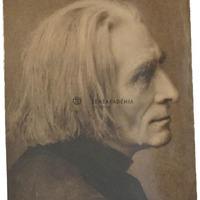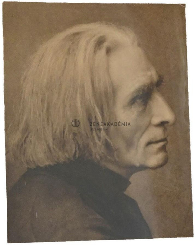 A középkorú zeneszerző félprofilból (jobb) ábrázolva. Sötét színű kabátot visel aminek csak a felső része látszik. Liszt pianinónál ülő képének nagyított, kisebb kivágata.