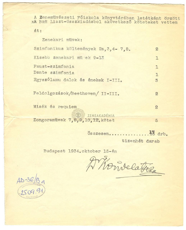 - A Franz Liszt Gesammelte Ausgabe köteteinek ajándékozásáról szóló értesítések, elismervények.