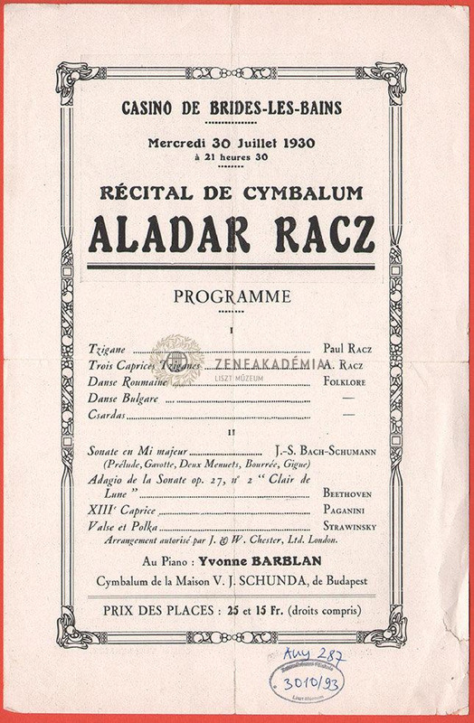 Műsor: cigány, román, bulgár és magyar táncok ill. Rácz, Bach, Schumann, Beethoven, Paganini és Stravinsky művei (km. Yvonne Barblan - zongora).