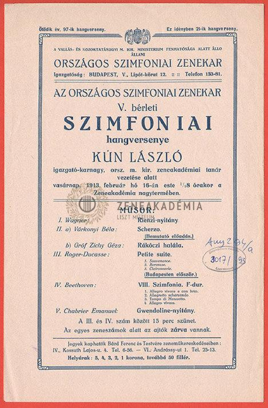 Műsor: Wagner, Beethoven, Chabrier, Roger-Ducasse, Zichy és Várkonyi Béla művei (Vez. Kun László)