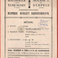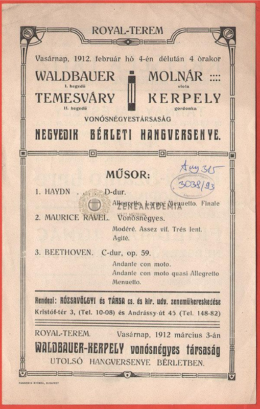 A Walbauer-Kerpely vonósnégyes bérleti hangversenyének műsora. A hátlapon Fritz Kreisler, Keéri-Szántó Imre, Szendy Árpád, Friedman Ignác és Hegyi Emánuel koncertjeinek hirdetése.