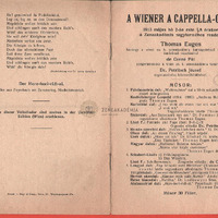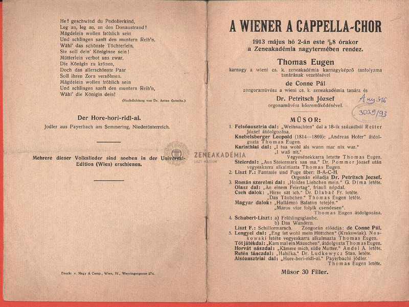 Műsor: magyar, cseh, szlovák, lengyel, román, rutén, olasz, horvát és ausztriai népdalfeldolgozások, Schubert dalok ill. Liszt: B-A-C-H prelúdium és fúga ill. Schillermarsch. Az énekes számok szövege közölve a műsorfüzetben.
