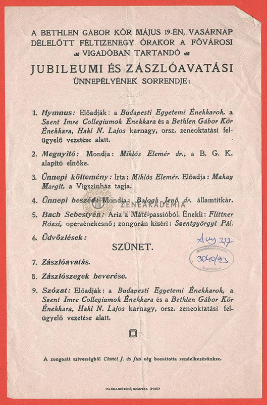 - A Bethlen Gábor kör jubileumi és zászlóavatási ünnepélyének műsora.