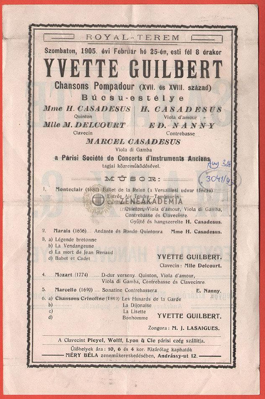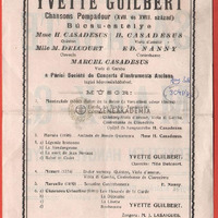 Yvette Guilbert koncertje. Hátoldalán Sarasate és Marx-G. hegedű zongora koncertjének hirdetése.