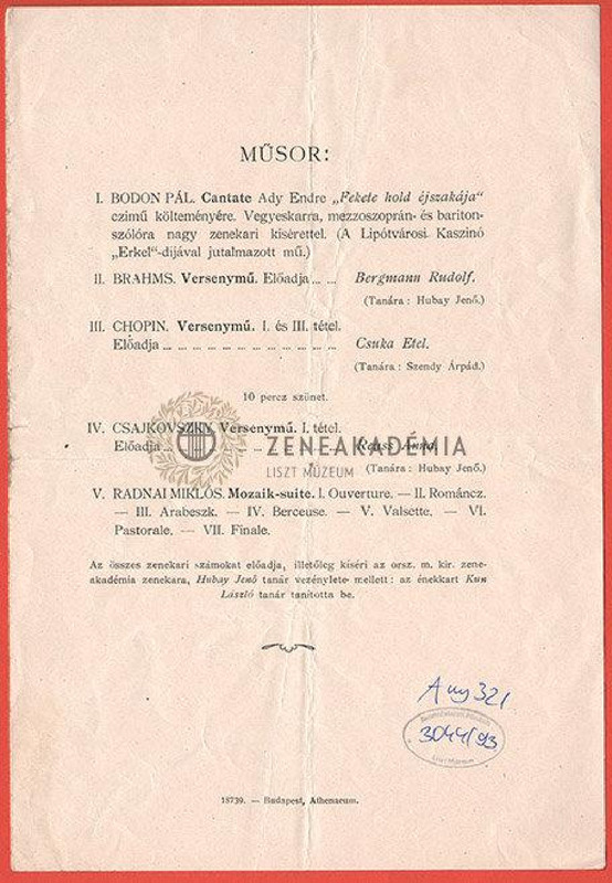 Műsor: Brahms, Csajkovszkij hegedűversenyei, Chopin zongoraverseny (?) ill. Bodon Pál és Radnai Miklós egy-egy műve.