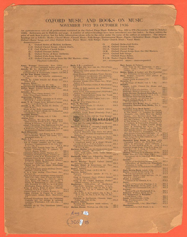 Az Oxford Music and books on music betűrendes katalógusa 1933 novembere és 1936 októbere közötti kiadványairól.