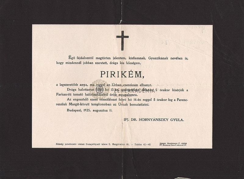 Hornyánszky Piroska gyászjelentése.
