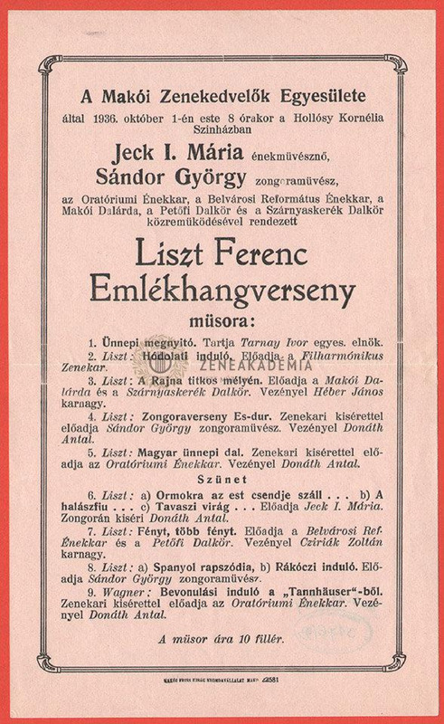 A Makói Zenekedvelők Egyesületének Liszt Ferenc emlékhangversenye.