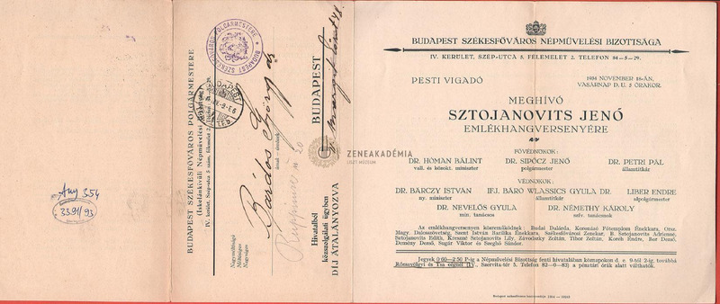 A meghívón a zeneszerző rövid életrajza és műjegyzéke. A meghívó Bárdos Györgynek címezve.