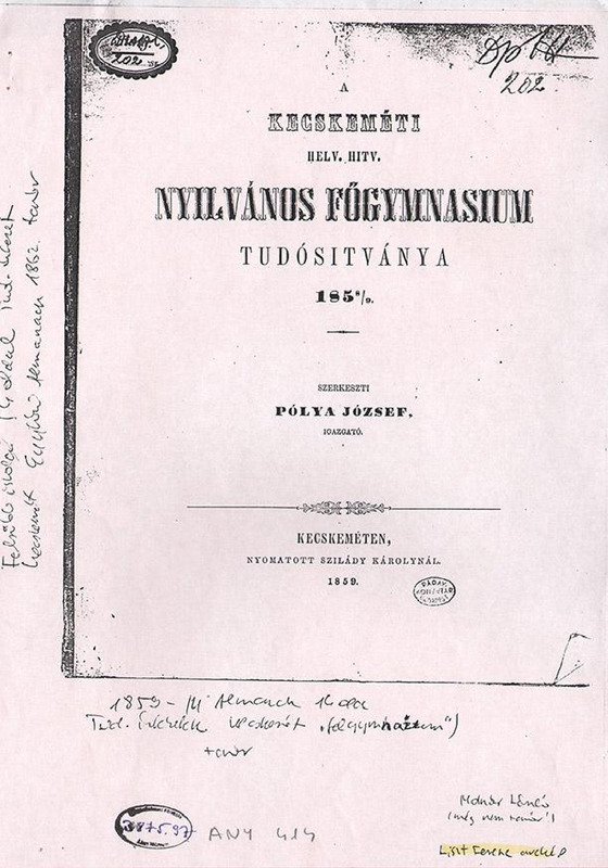 - A Kecskeméti Belv. Hitv. Főgymnasium tudósítványa.