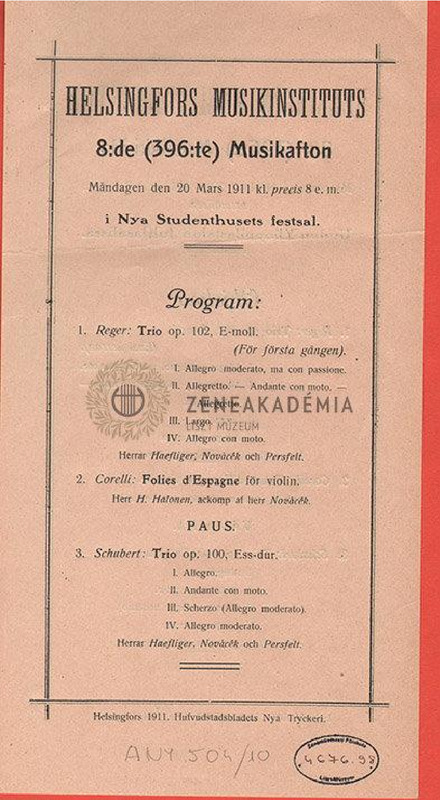 Viktor Novacek temesvári születésű hegedűművész közreműködésével ill. 1907.V.27. Liszt: B-A-C-H prelúdium és fúga (Herra Vainö Makinen zg.), 1911.IV.10 Liszt: Legend II. és XI. Magyar rapszódia, 1913.V.30. Liszt: Gondoliera, Die Loreley, Waldesrauschen, E-dúr polonéz (Ilmari Hannikainen zg.)