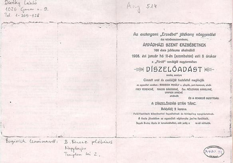 - Esztergomi "Erzsébet" jótékony egyesület díszelőadásának műsora.
