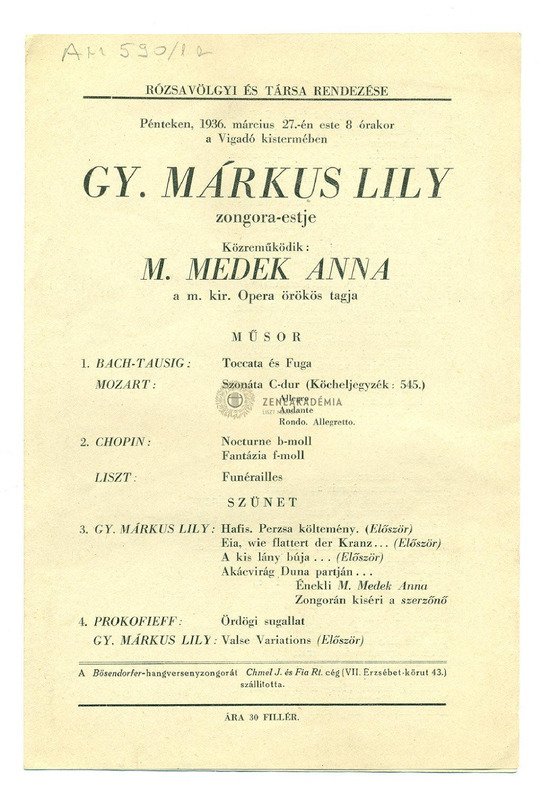 Koncertek Márkus Lily (zongoraművésznő) közreműködésével ill. koncertek, melyeken a művei elhangzottak.