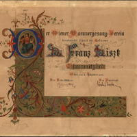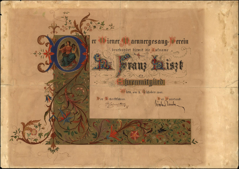 A Wiener Männergesang-Verein díszoklevele Liszt tiszteletbeli tagságáról.