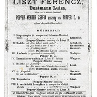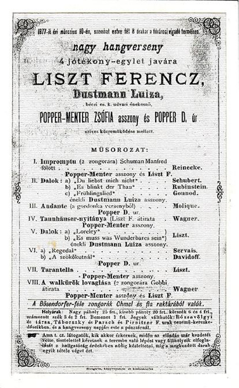 Műsor: Reinecke, Schubert, Rubinstein, Gounod, Molique, Servais, Davidoff, Wagner és Liszt (?) művei (km. Liszt, Dustmann Lujza, Sophie Menter, Popper Dávid).