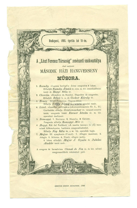 - Műsor: Szendy Árpád, Chován, Erney József, Somogyi Mór, Hegyi, Major J. Gyula művei és Liszt Ferenc művei.