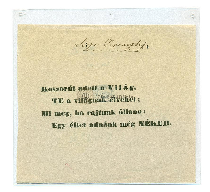 - Négy soros vers, felirata: "Liszt Ferenchez".