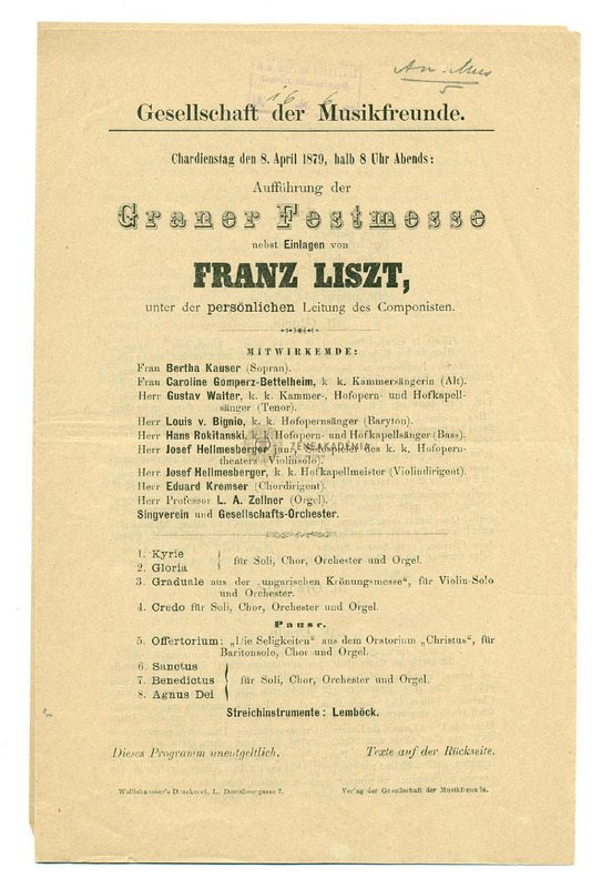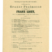 Közreműködők: Bertha Kauser, Caroline Gomperz-Bettelheim, Gustav Walter, Louis v. Bignio, Hans Rokitanski (énekesek) ill. Josef Hellmesberger (1. heg), Eduard Kremser (karigazgató), Zellner, L.A., ill. a Singverein és a Gesellschafts-Orchester vez. Liszt. A mű szövege latinul és németül (utóbbi gót betűs).