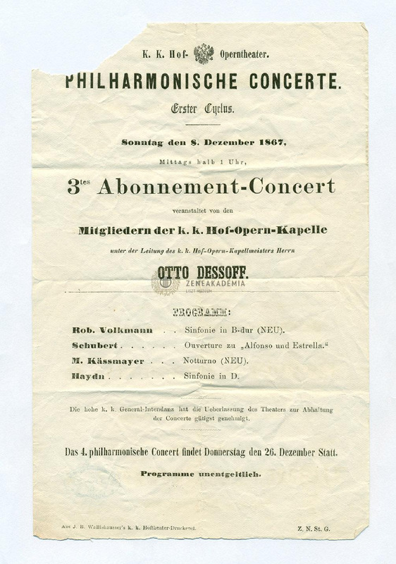 Műsor: Volkmann, Schubert, Kassmayer és Haydn művei. (Közreműködnek a K.K. Hof-Opern-Kapelle tagjai, vez. Otto Dessoff).